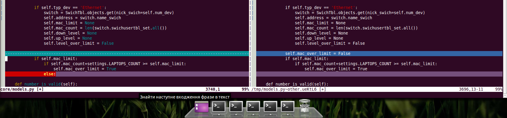 Відкриється текстовий редактор Vim (vimdiff), поділений на декілька частин, в кожній з яких буде показано відповідний файл.